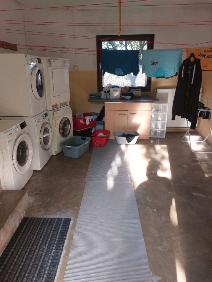 B) Das Einfamilienhaus:Das Einfamilienhaus hat eine Wohnfläche von ca.160 m². Diese teilt sich insgesamt auf neun Zimmern auf, zusätzlich gibt es 1 Küche, 2 Badezimmer und 1 Gäste WC. Der gemütlicher Hobby- oder Partyraum mit Holzvertäfelung an der Decke und gefliestem Boden lädt zum Entspannen oder Feiern ein. Der große Hauswirtschaftsraum bietet viel Platz für Waschen & Trocknen.Außerdem hat man die Möglichkeit in dem Hauswirtschaftsraum zu kochen und das alltägliche alles Vorort zu erledigen, ein Aufbewahrungsraum für Lebensmittel steht ebenfalls zur Verfügung. Sowie das Gäste WC – alles befindet sich unten im Eingangsbereich, ein Schritt vor dem Garten entfernt. Nach dem Betreten der offenen Treppe erreichen Sie das den breiten Flur, der zum Schmuckstück des Einfamilienhauses führt. Hierbei handelt es sich um die 40 m² große und lichtdurchflutete Wohnzimmer mit ebenfalls einem großen Balkon, der zum Verweilen zum Gartenblick einlädt.Alle Fenster sind doppelt verglast und haben außen Jalousien. Der Fußboden ist teils mit schönem Parkett oder Laminat verlegt.Das Badezimmer ist hell gefliest, es befindet sich eine Badewanne und eine Dusche mit jeweils 2 Waschbecken.Außerdem verfügt das Einfamilienhaus über 2 Garagen.
